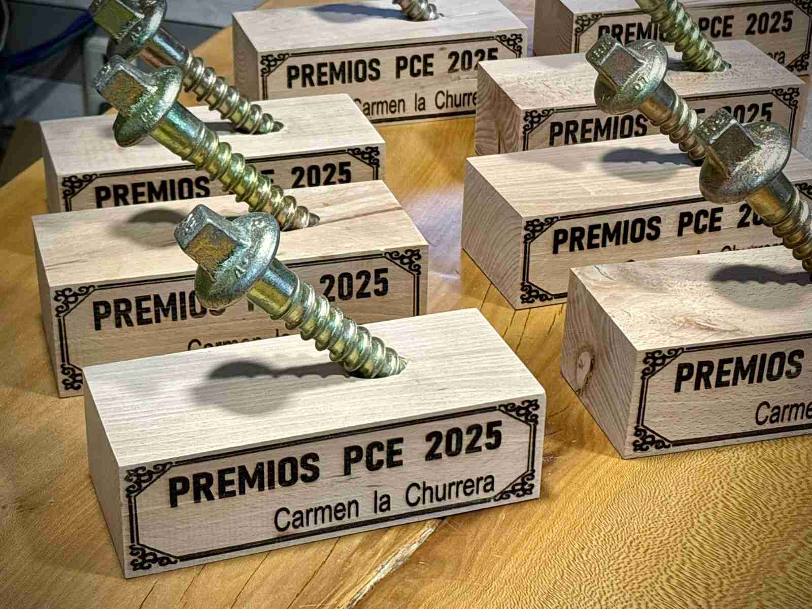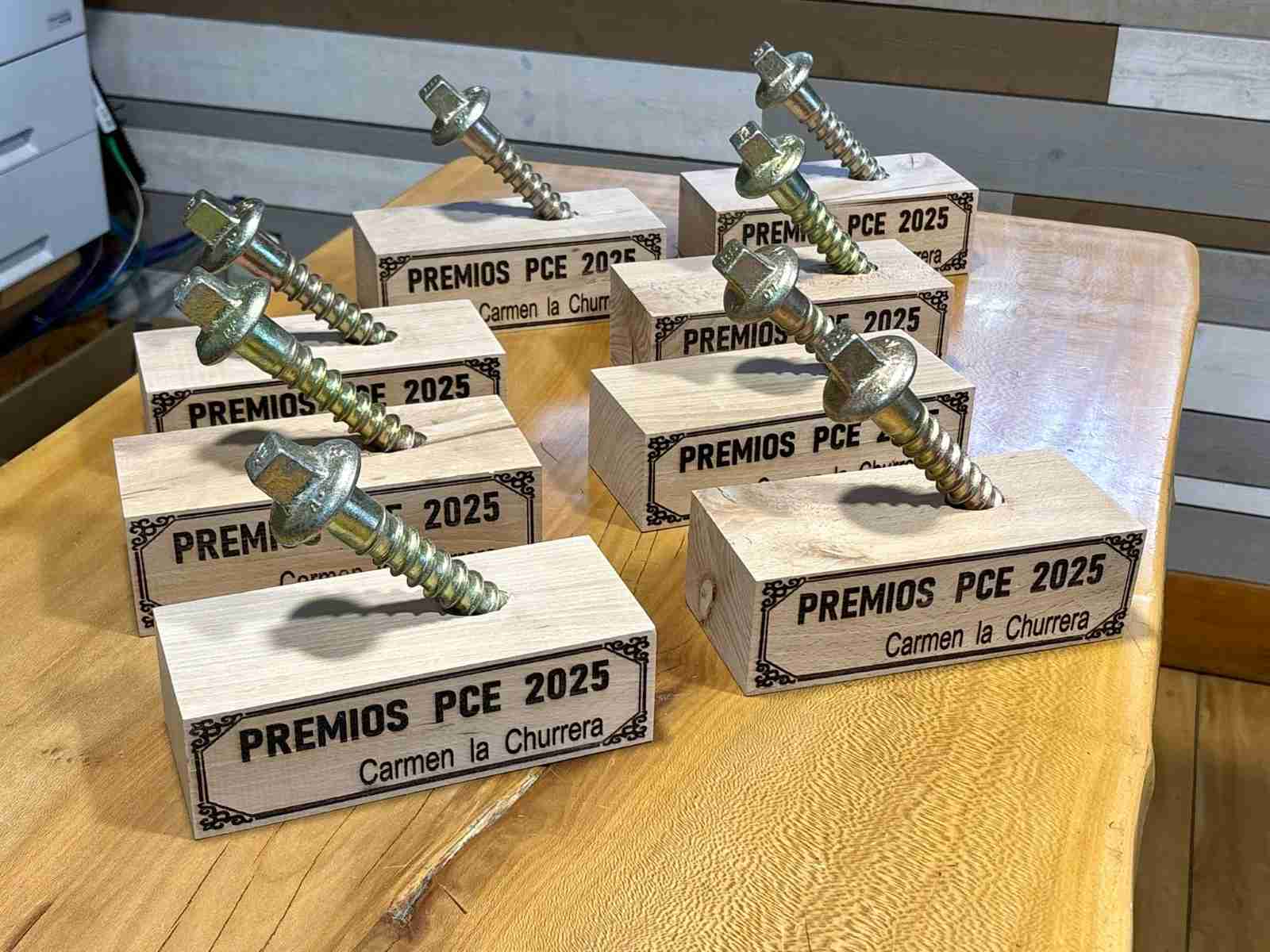 El trofeo mantiene su característica forma de tornillo de las traviesas del tren, un guiño directo a la fuerte tradición ferroviaria de Miranda de Ebro. La pieza se elabora en Maderas Susaeta, que aporta un trabajo artesanal ligado al tejido económico y social local.